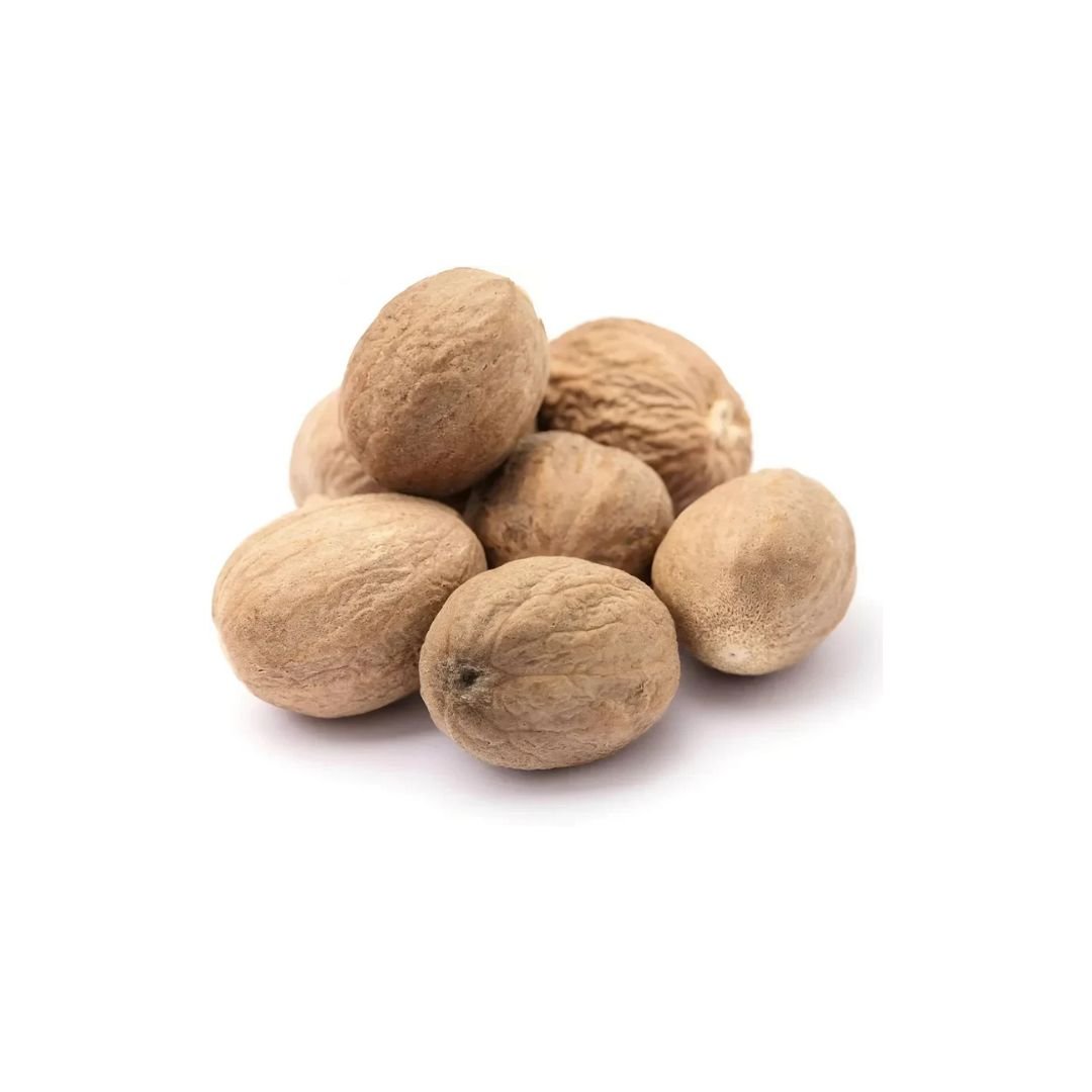 Large-sized whole nutmeg with shell, offering intense aroma and rich flavour. Ideal for grating fresh into sweets, curries, and beverages. The shell helps preserve freshness and natural oils for longer storage.